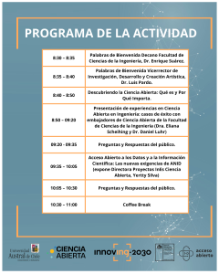 Esta jornada, que se realizará el miércoles 20 de agosto desde las 08.30 horas en el Auditorio del Edificio 9000 del Campus Miraflores, está enfocada en la comunidad de la FCI, ya que abordará la ciencia abierta desde un punto de vista de la ingeniería y su implicancia en los proyectos de la Agencia Nacional de Investigación y Desarrollo (ANID).